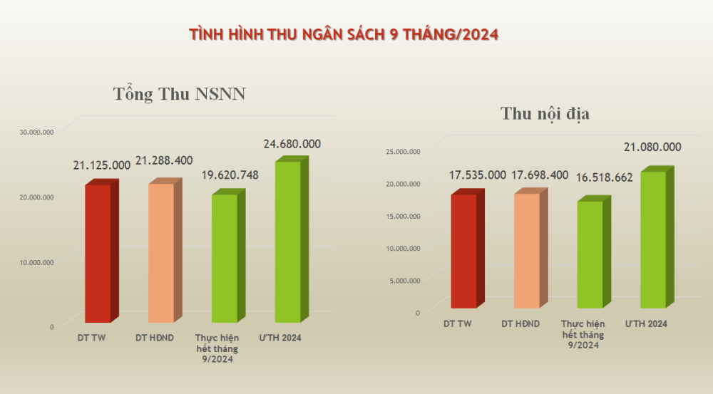 According to the results of state budget collection by the end of September 2024, total state budget revenue, domestic revenue, balanced revenue including revenue according to budget decentralization all reached and exceeded the average collection progress, higher than the same period. In particular, the district-level budget collection situation has improved every month; by the end of September, district-level state budget revenue has reached and exceeded the average collection progress, 1 district has reached and exceeded the estimate.