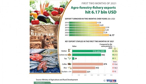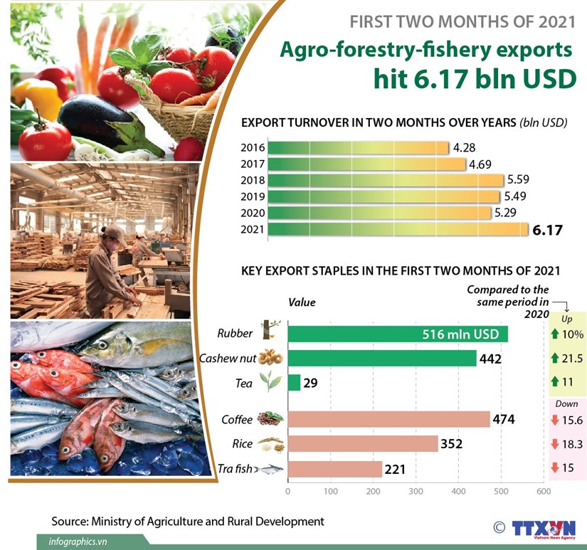 Vietnam's agro-forestry-fishery exports hit 6.17 bln USD in the first two months of this year.