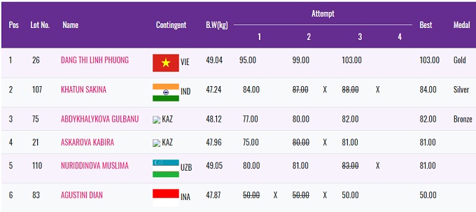 Dang Thi Linh Phuong claimed the women’s 50kg title with a best lift of 103kg, followed by Khatun Sakina of India and Abdykhalykova Gulbanu of Kazakhstan with respective lifts of 84kg and 82kg.
