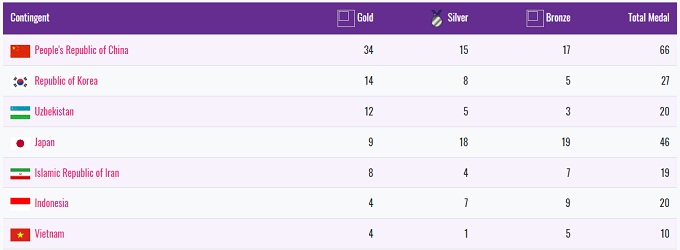 As of 9pm on October 8, Vietnam stood in seventh place in the provisional standings with a collection of four golds, one silver and five bronzes.