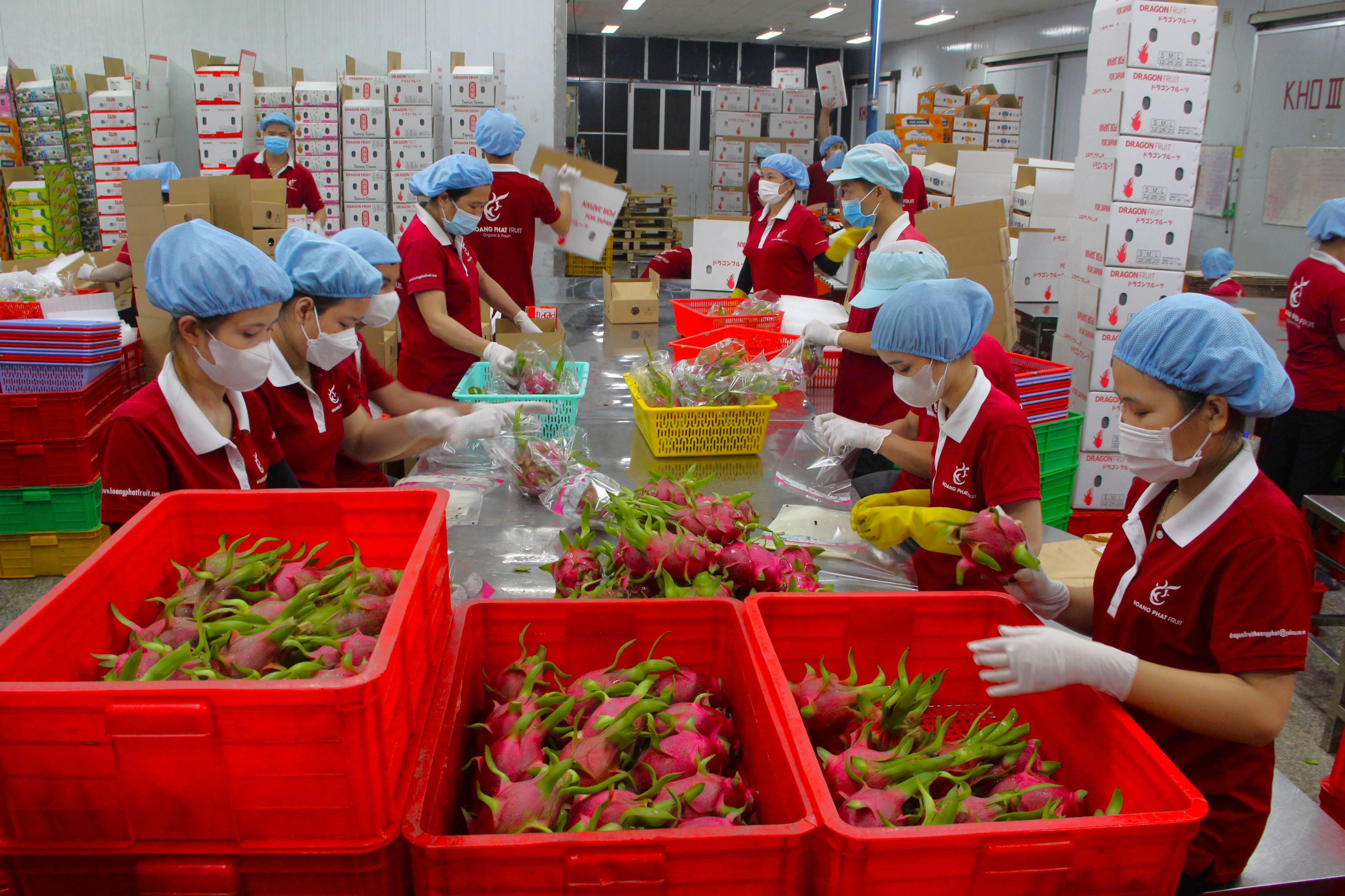 Workers at a dragon fruit warehouse in Chau Thanh district pack dragon fruits for export