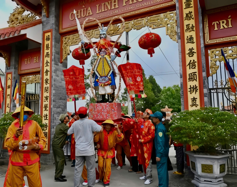 After the ceremony, there was a ritual to invite Tieu Dien Dai Si from Linh Phuoc Pagoda to Linh Vo Pagoda. Mr. Tieu, or Tieu Dien Dai Si, is an incarnation of Bodhisattva Avalokitesvara, revered by the people as the god who subdues wandering souls and saves all living beings. The paper statue of Mr. Tieu was elaborately prepared for many months before the festival, and after completion, it was placed at Linh Phuoc Pagoda.