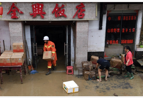 A firefighter transfers items from a flooded restaurant in Bikou Township of Wenxian County, northwest China's Gansu Province, July 13, 2018. China's disaster relief authorities launched a level IV emergency response plan Thursday, July 12, to help flood victims in west China's Sichuan and Gansu provinces. (Photo: Xinhua)