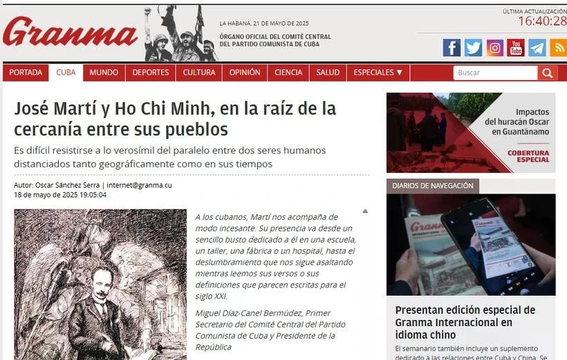 In a prominent article featuring José Martí and Ho Chi Minh as the ties that bind two nations, the Granma, the official newspaper of the Communist Party of Cuba, drew parallels between the two leaders, particularly in their vision of youth and education. Quoting Ho Chi Minh’s maxim, "For the sake of ten years, we must plant trees, for the sake of 100 years, we should cultivate people," the article noted its resonance with Martí’s reflection in La Edad de Oro: “Children are the hope of the world.”