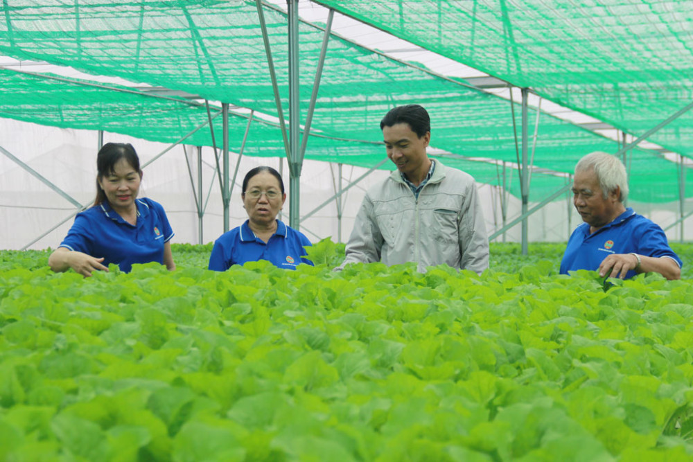 Mr. Nguyen Tran Minh Tai (2nd from right, Phuoc Ke Hamlet, Phuoc Lam Commune, Can Giuoc District) introduces the hydroponic vegetable growing model