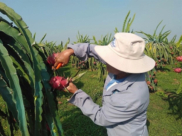 A farmer in a dragon fruit garden in the southern province of Binh Thuan. (Photo: VNA)
