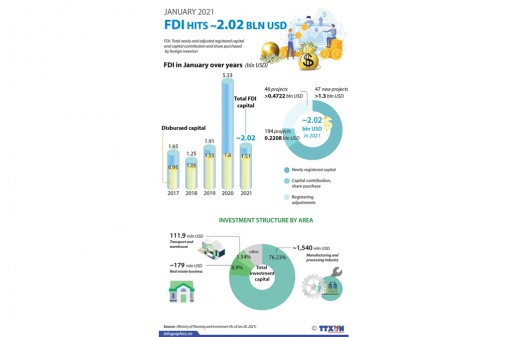 Vietnam attracted more than US$2billion in FDI in January, 37.8 percent higher than in the same period in 2020, according to the Ministry of Planning and Investment.