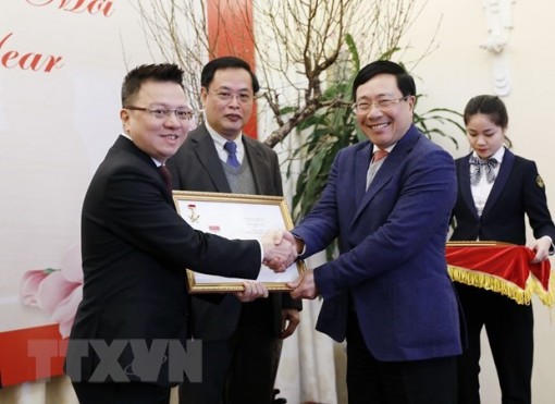 Deputy Prime Minister and Foreign Minister Pham Binh Minh (right) presents the insignia “For the cause of the diplomatic sector” to Deputy General Director of the Vietnam News Agency Le Quoc Minh (Photo: VNA)