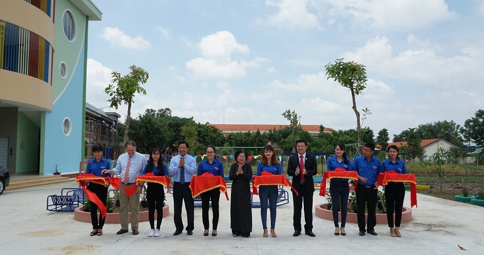 Delegates cut the ribbon to inaugurate the playground at Nhon Thanh Trung Kindergarten