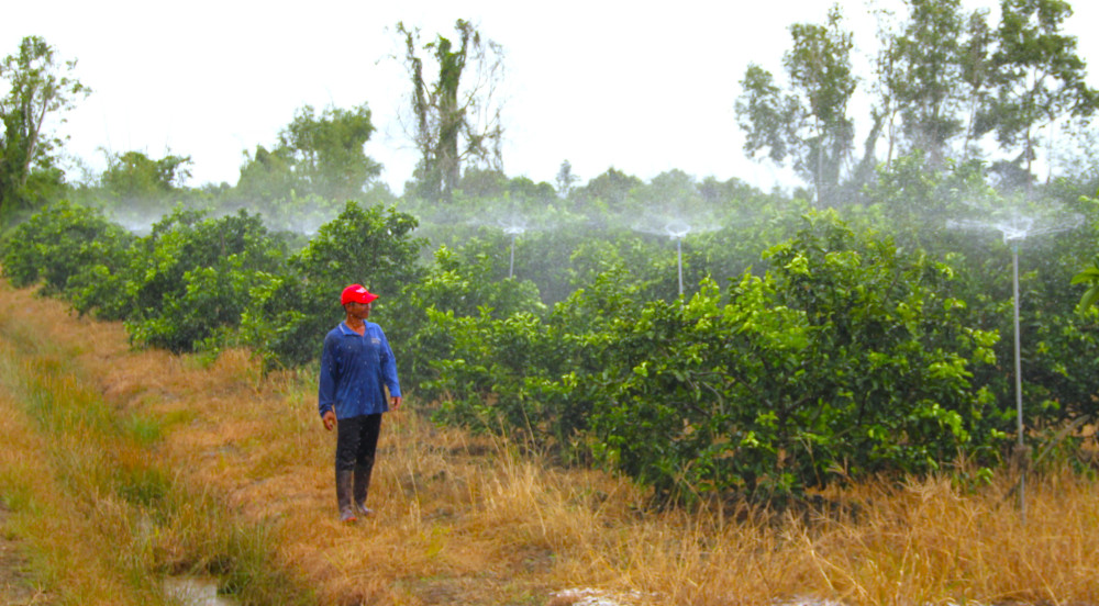 The automatic irrigation system helps Mr. Tran Van Linh's lime garden grow evenly, reducing costs and labor