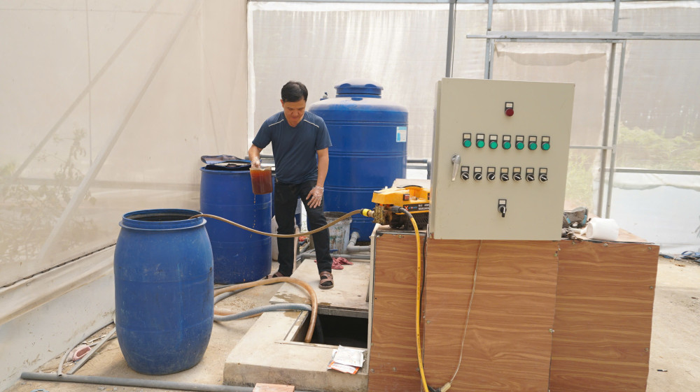 Mr. Nguyen Tuan Anh applies drip irrigation technology to mix fertilizer directly into the water source, helping to save 30-40% of production costs
