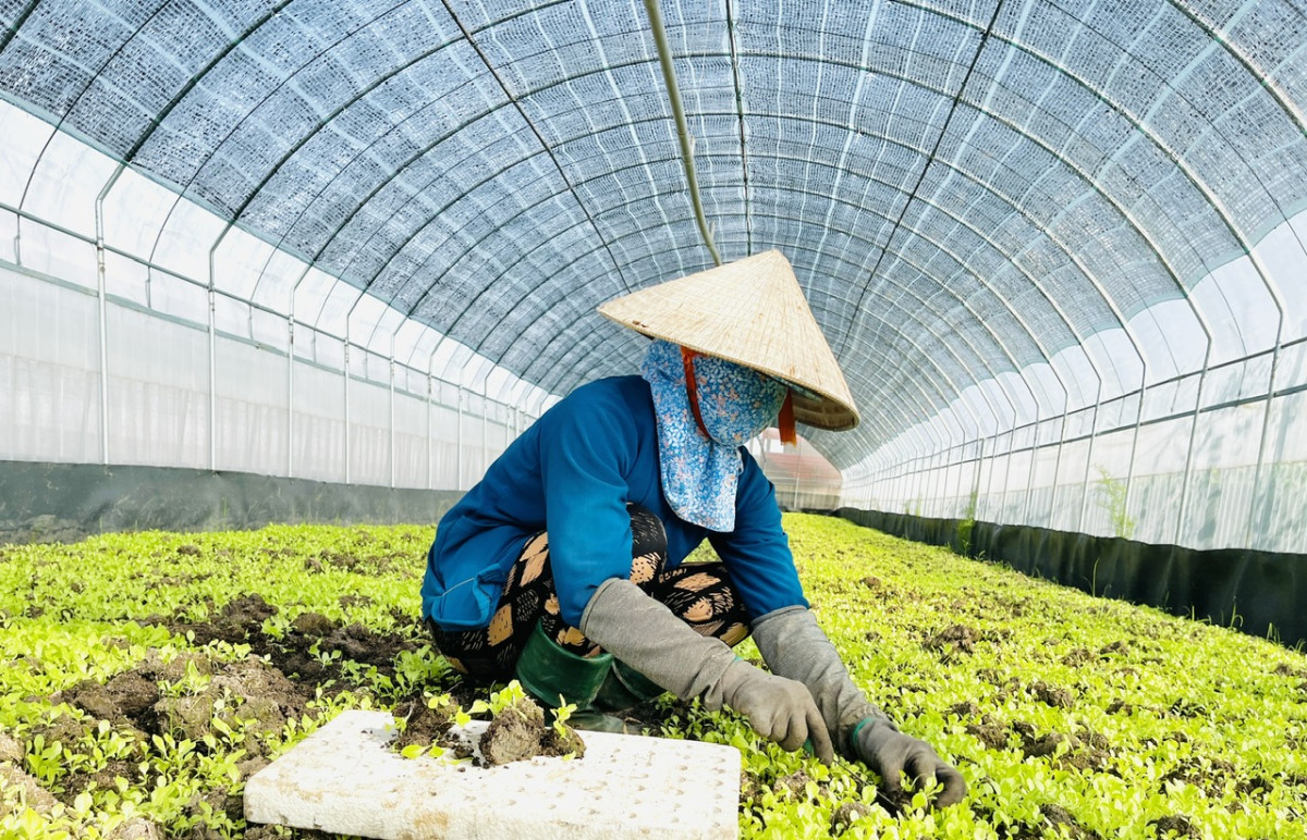 Members of Khanh Hau Vegetable and Fruit Agricultural Cooperative grow vegetables organically in greenhouses
