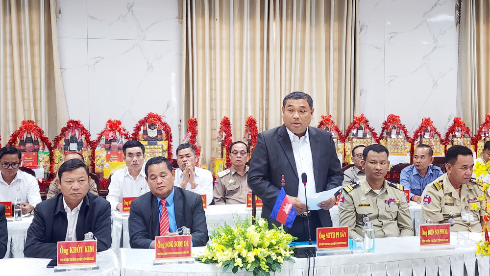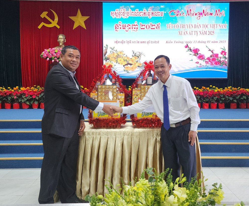 On January 13, the District Chief of Kongpongro - Soth Pi Say, Svay Rieng Province, Kingdom of Cambodia led a delegation to visit and give New Year greetings to the Town Party Committee, People's Council, People's Committee, and Vietnam Fatherland Front Committee of Kien Tuong Town, Long An Province.