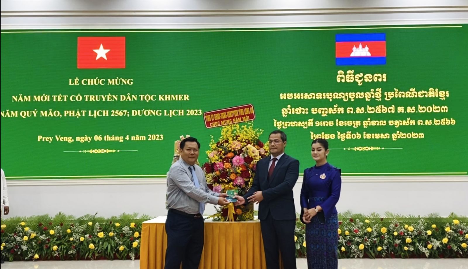 On April 6, Vice Chairman of Provincial People's Committee - Huynh Van Son and the delegation of Long An province visited and gave Chol Chnam Thmay Traditional New Year greeting to Prey Veng province, Kingdom of Cambodia. Also attending the delegation were leaders of Dong Thap and Tay Ninh provinces.