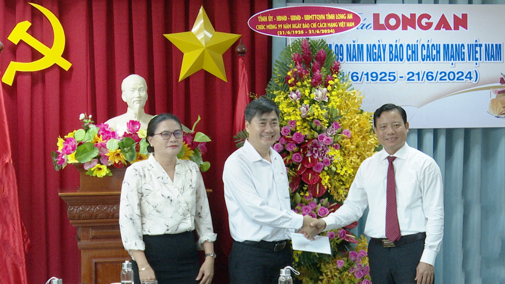 Vice Chairman of Provincial People's Committee - Pham Tan Hoa presents flowers and gifts to Long An Newspaper