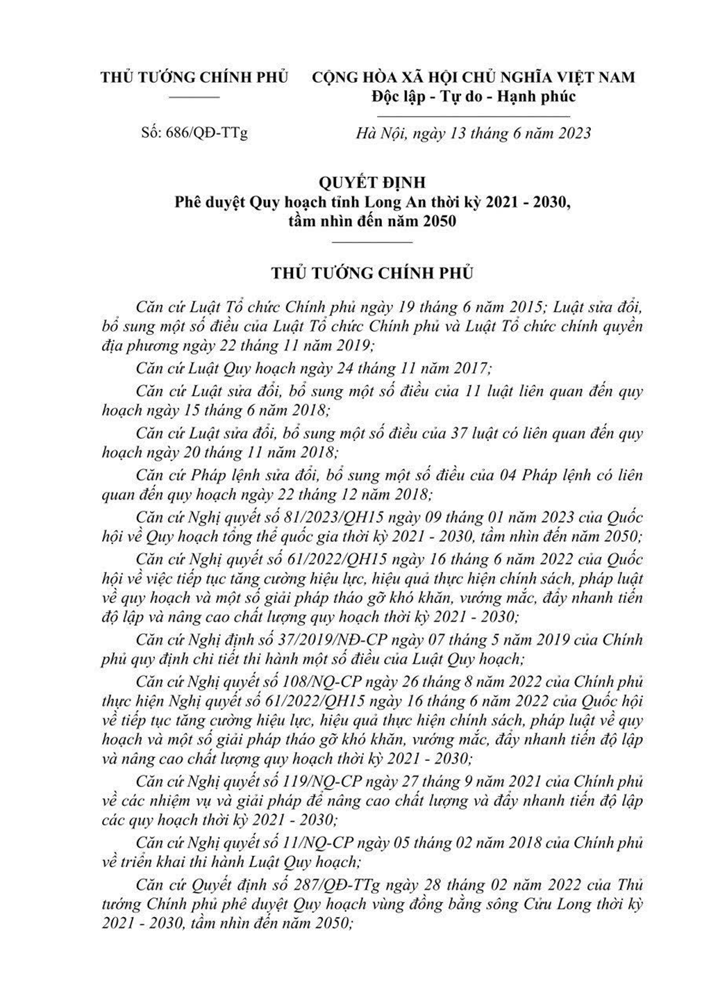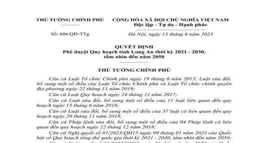 After more than 2 years of implementation, on June 13, 2023, the Provincial Planning for the period of 2021-2030, with a vision to 2050 was approved by the Prime Minister in Decision No. 686. Long An province is the 10th locality in the country and the first in the southern region to be approved for planning./.