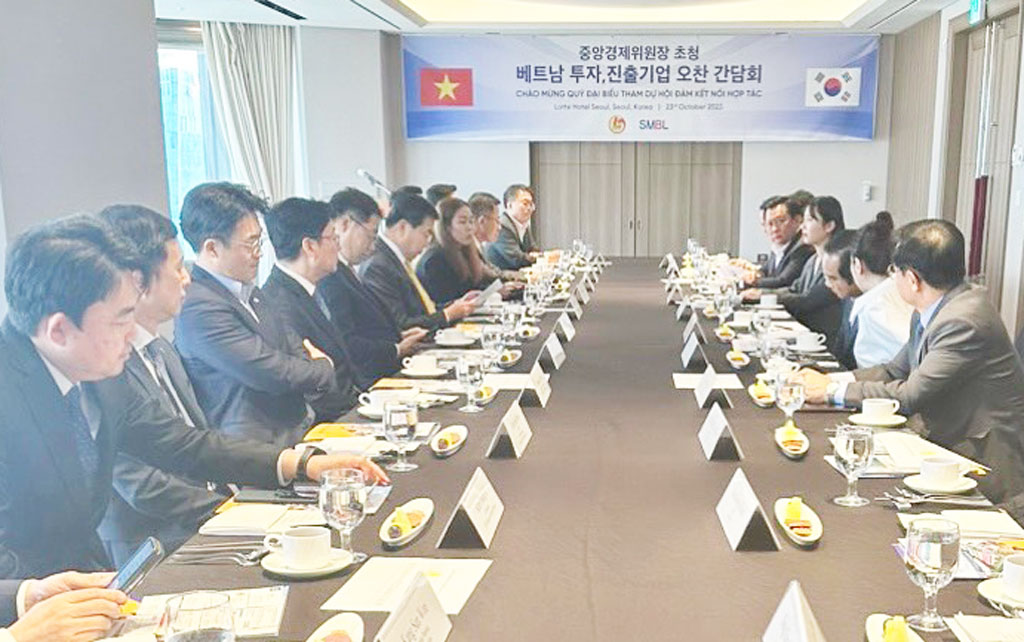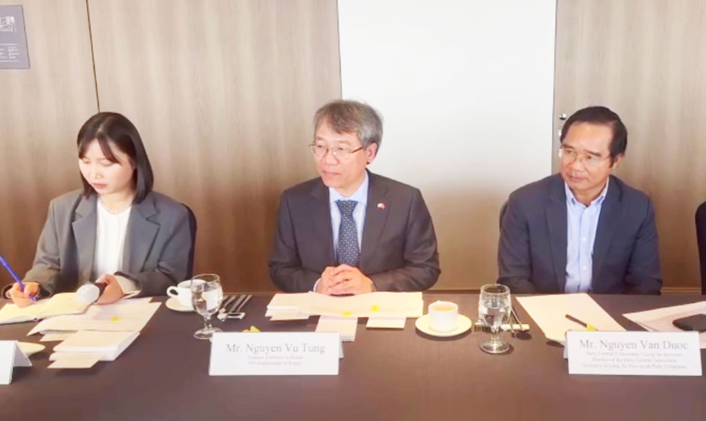 On the trip to Korea on October 23, Long An's delegation led by Secretary of Provincial Party Committee, Chairman of Provincial People's Council - Nguyen Van Duoc had a meeting with Lotte Group; APM Group; Industrial Bank of Korea; Korea Development Bank, etc. Also attending the meeting was Ambassador Extraordinary and Plenipotentiary of Vietnam in Korea - Nguyen Vu Tung.