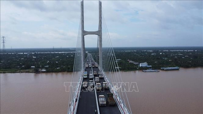Dozens of vehicles successfully test-load Rach Mieu 2 Bridge. (Photo: VNA)