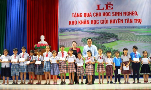 NA Chairwoman - Nguyen Thi Kim Ngan and Secretary of the Provincial Party Committee, Chairman of Provincial People's Council of Long An province - Pham Van Ranh give scholarships to students