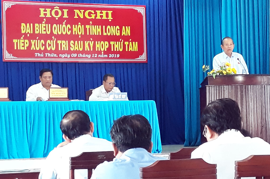 On December 9, the National Assembly Delegation of Long An province included Mr. Truong Hoa Binh - Standing Deputy Prime Minister; Head of the provincial National Assembly Delegation, Chairman of the provincial Vietnam Fatherland Front Committee - Truong Van No and Deputy Director of the Department of Transport - Dang Hoang Tuan had a meeting with 130 voters in Nhi Thanh, Binh Thanh, Binh An districts and Thu Thua town of Thu Thua district. Vice Chairman of the provincial People's Committee - Pham Van Canh attended the meeting.