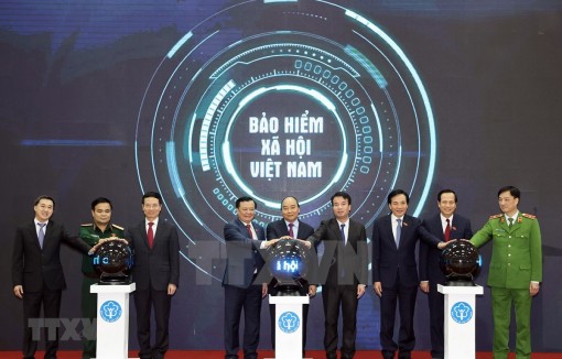 Prime Minister Nguyen Xuan Phuc and other delegates press the button to launch the “VssID - Digital Social Insurance” application (Photo: VNA)