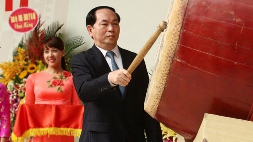 President Tran Dai Quang beat the drum to open the 2017- 2018 school year. (Photo: dantri.com.vn)