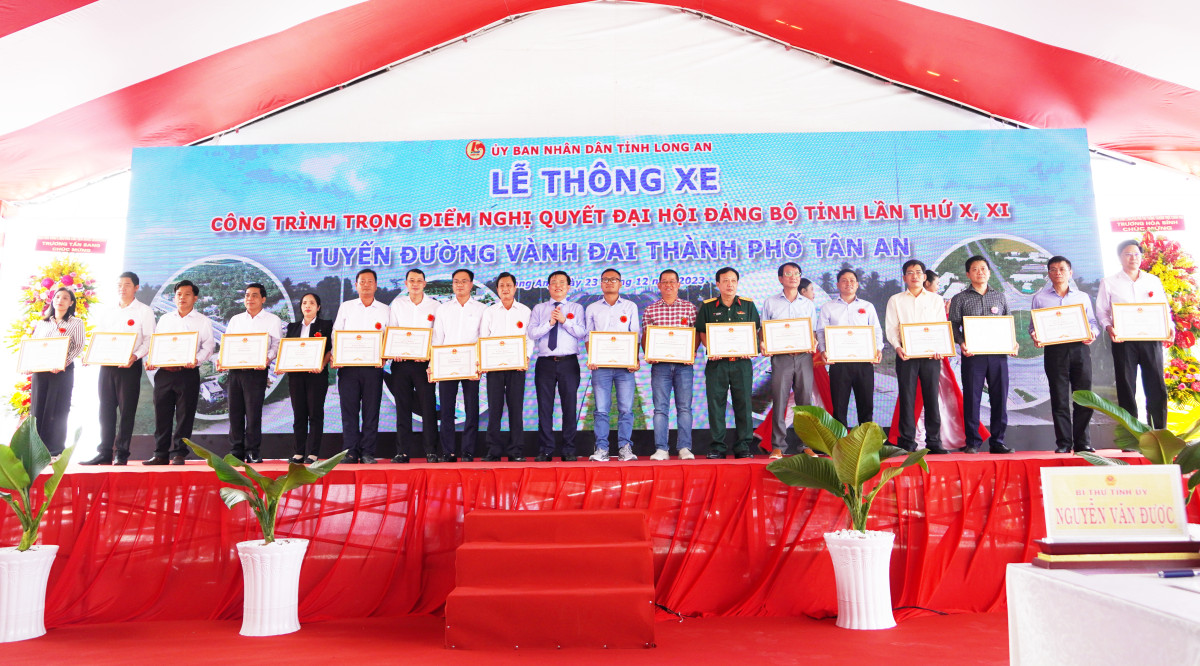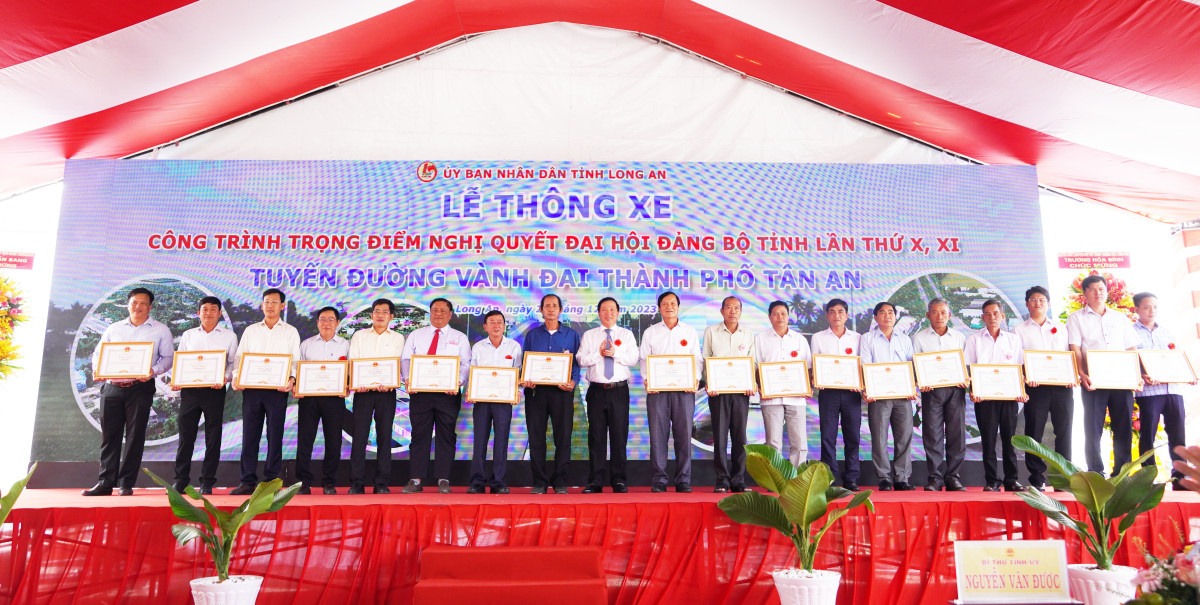 At the traffic opening ceremony, many groups and individuals received certificates of merit from the Chairman of Provincial People's Committee for their outstanding achievements in the construction of Tan An City Ring Road.