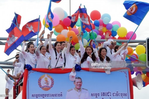 Supporters of the Cambodian People's Party (CPP) gesture during a general election campaign in Phnom Penh on July 7. (Photo: Getty Image)