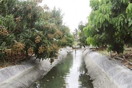 A longan orchard in Soc Trang Province’s Cu Lao Dung District grows well despite saltwater intrusion in rivers and canals since farmers have stored water in ditches covered with plastic sheets in their orchards. (Photo: VNA)