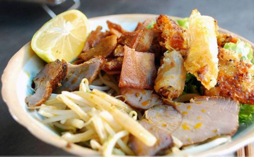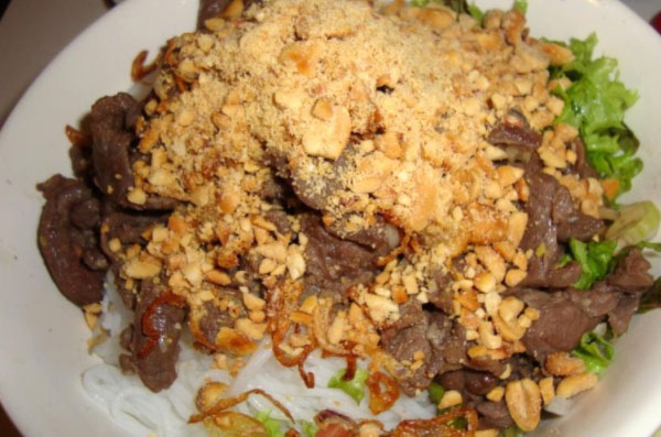 This bowl of vermicelli noodles - widely popular in Hanoi - comes sans broth, keeping the ingredients from becoming sodden and the various textures intact. The tender slices of beef mingle with crunchy peanuts and bean sprouts and are flavoured with fresh herbs, crisp dried shallots and a splash of fish sauce and fiery chilli pepper.