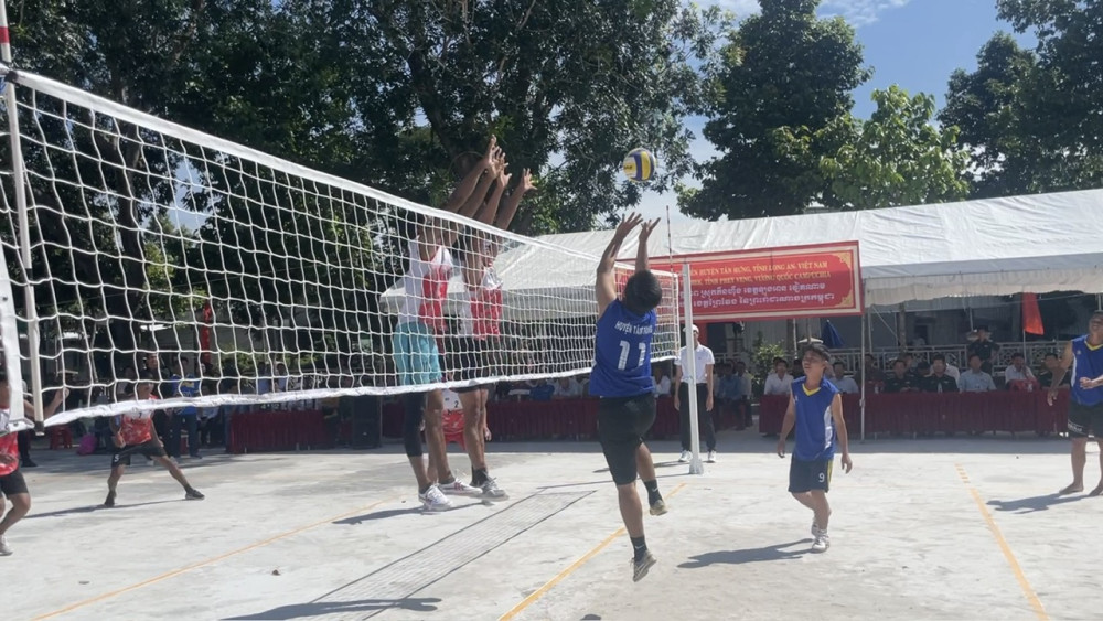 The exchange took place in a joyful and united atmosphere. Delegates enjoyed dance, singing, and circus performances by art troupes from the Long An Provincial Cultural and Art Center, Tan Hung District, and KamPong TraBaek District. At the same time, they watched the friendly match between the Tan Hung District Volleyball Team and the KamPong TraBaek District Volleyball Team.