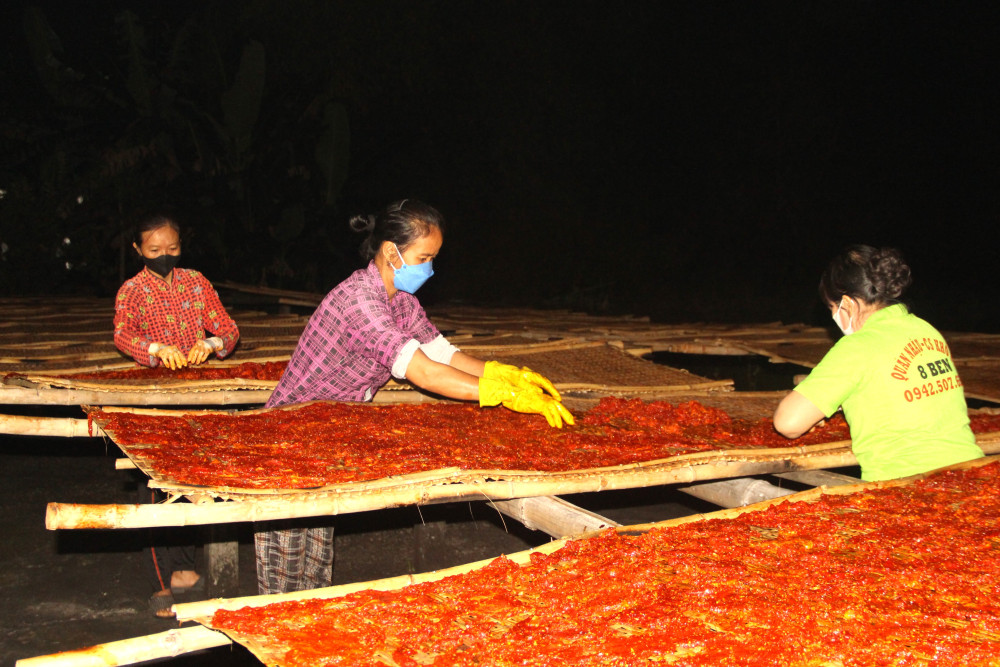 Workers at Tam Ben Beef Jerky Production Facility (Hiep Hoa Commune, Duc Hoa District) dry seasoned meat on a drying rack