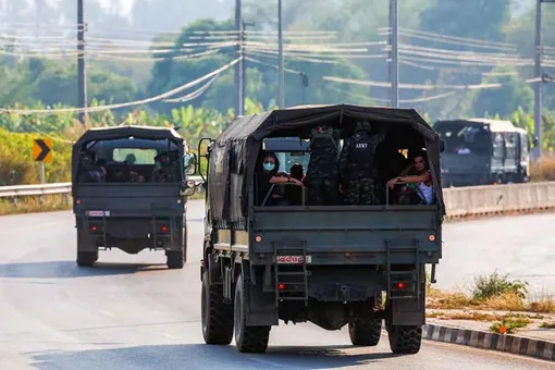 Multinational victims of scam centres, who were tricked or trafficked into working in Myanmar, travel on army trucks after they were sent to Thailand, in Phop Phra district, Tak province, February 12, 2025. (Photo: Reuters)