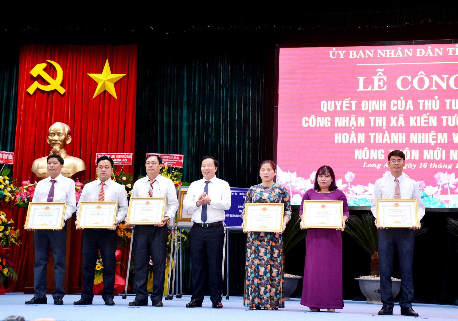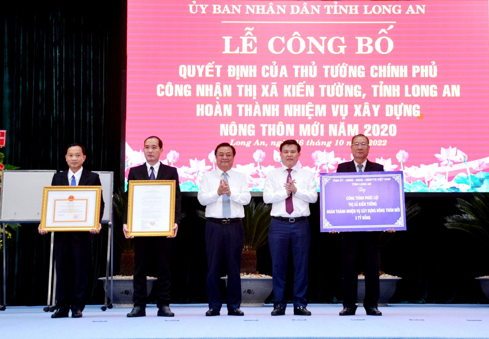 Minister of Agriculture and Rural Development - Le Minh Hoan and Permanent Deputy Secretary of the Provincial Party Committee, Head of the Provincial Delegation of National Assembly - Nguyen Thanh Hai handed over the Prime Minister's decision to recognize Kien Tuong town completing the task of building a new-style rural area.
