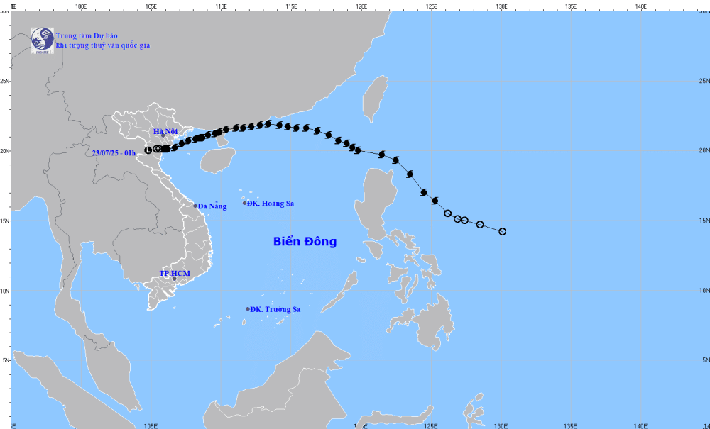 As of 1:00 am, the low-pressure area was located at around 20.0 degrees North latitude and 104.8 degrees East longitude. The strongest winds near its centre were below level 6 (under 39 km/h). Earlier, in the night of July 22, it had weakened into a low-pressure area over the Vietnam–Laos border.