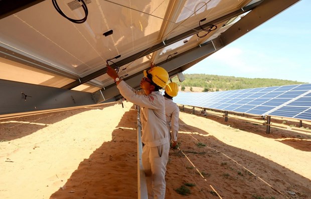 Workers are checking the solar panel operating system at Hong Phong 4 Solar Power Plant in Hong Phong commune, Bac Binh district, Binh Thuan province. (Photo: VNA)