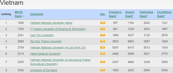 The Vietnam National University, Hanoi, (VNU) has remained as the top higher education institution in Vietnam with a world rating of 1090 in the “Webometrics Ranking of World Universities”, announced by the Cybermetrics Lab, a research group of the Spanish National Research Council (CSIC).