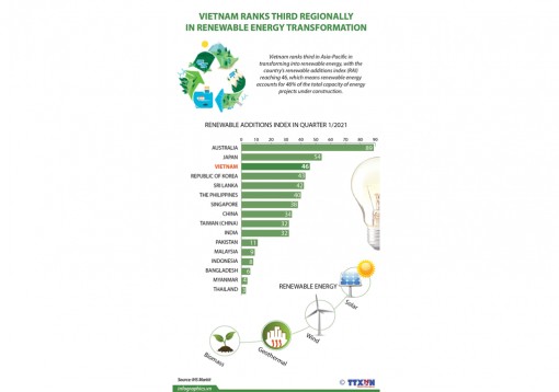 Vietnam ranks third in Asia-Pacific in transforming into renewable energy, with the country’s renewable additions index (RAI) reaching 46, which means renewable energy accounts for 46% of the total capacity of energy projects under construction.
