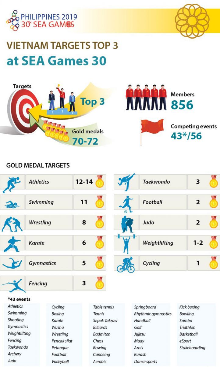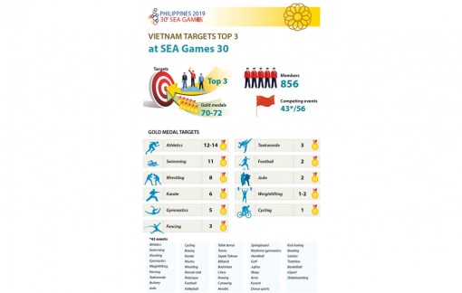 The Vietnamese delegation aims to bag 65-70 gold medals to rank in the top three at the region’s biggest sporting event, 30th SEA Games, in the Philippines.