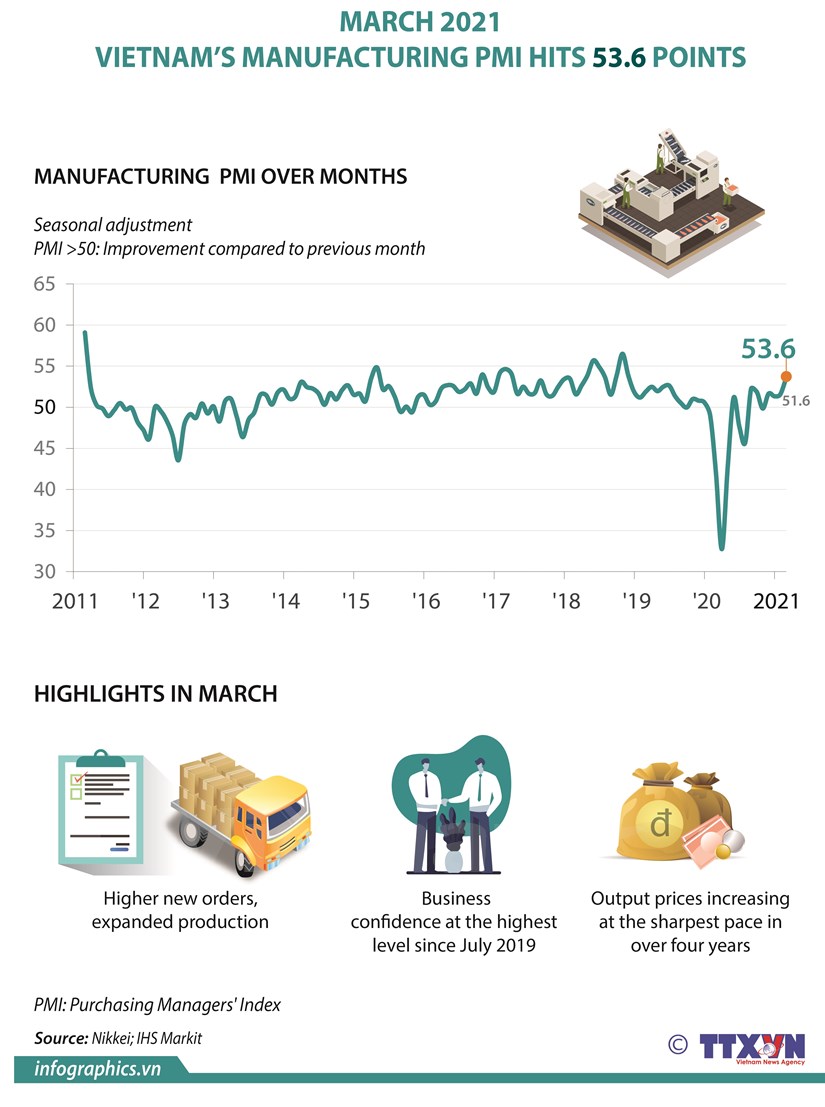 Vietnam's manufacturing PMI hit 53.6 points in March, up from 51.6 in February, according to a report by the London-based global information provider IHS Markit.